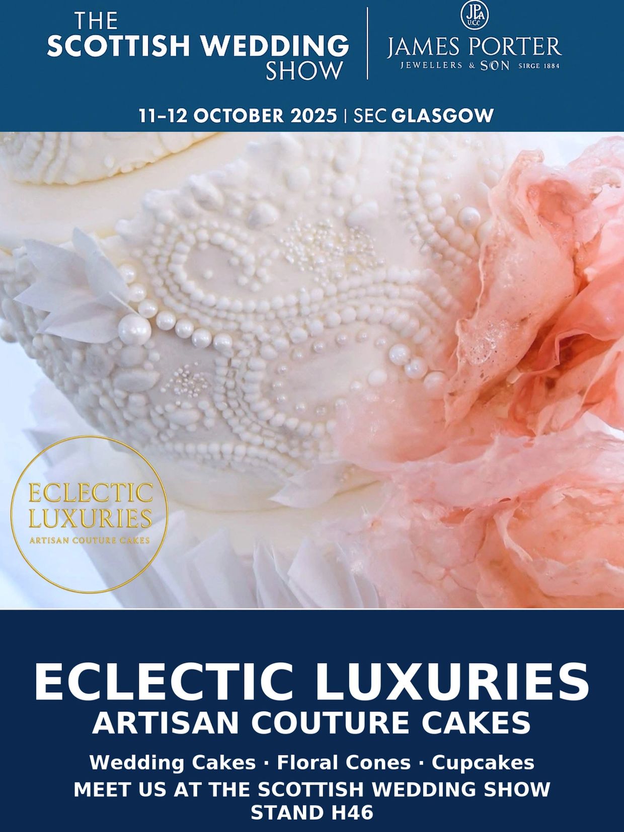 On 11–12 October 2025 Eclectic Luxuries – Artisan Couture Cakes will take part in the Scottish Wedding Show at the SEC in Glasgow. Recognised as Scotland’s leading wedding exhibition, the event brings together the finest suppliers and gives couples the opportunity to explore services defined by luxury, quality and artistry.